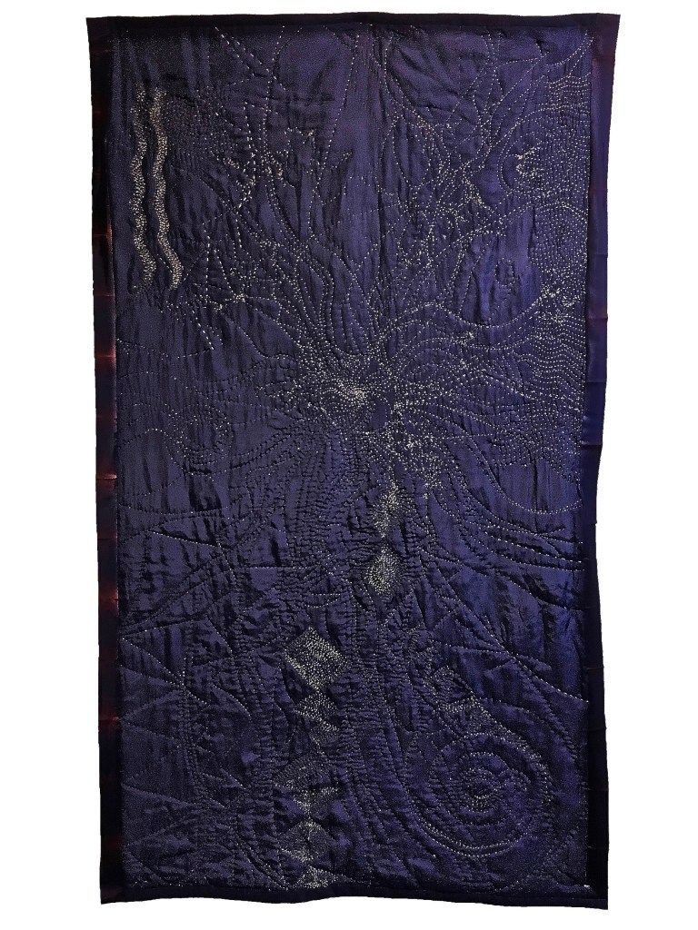 Hand quilted, woven, appliqued fabrics. 98″x 36″. Collection of the artist.