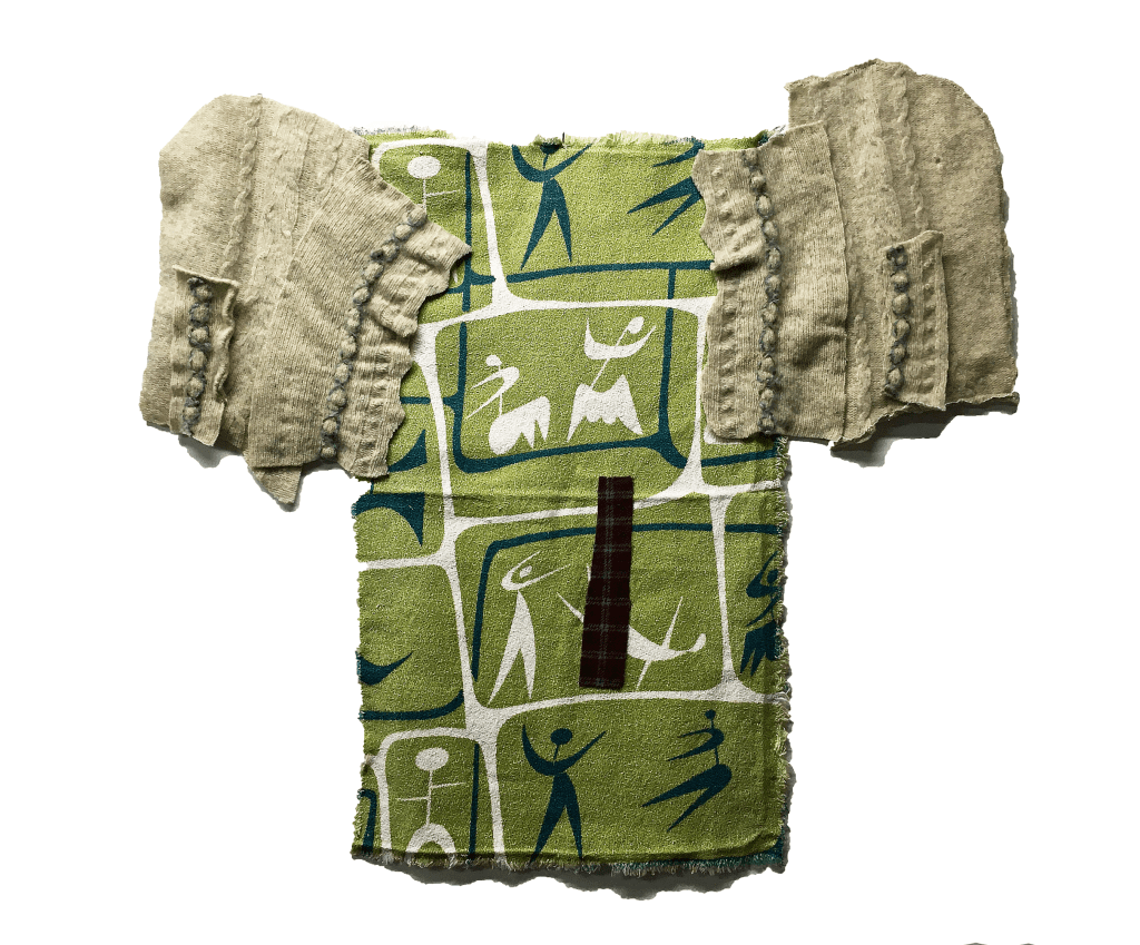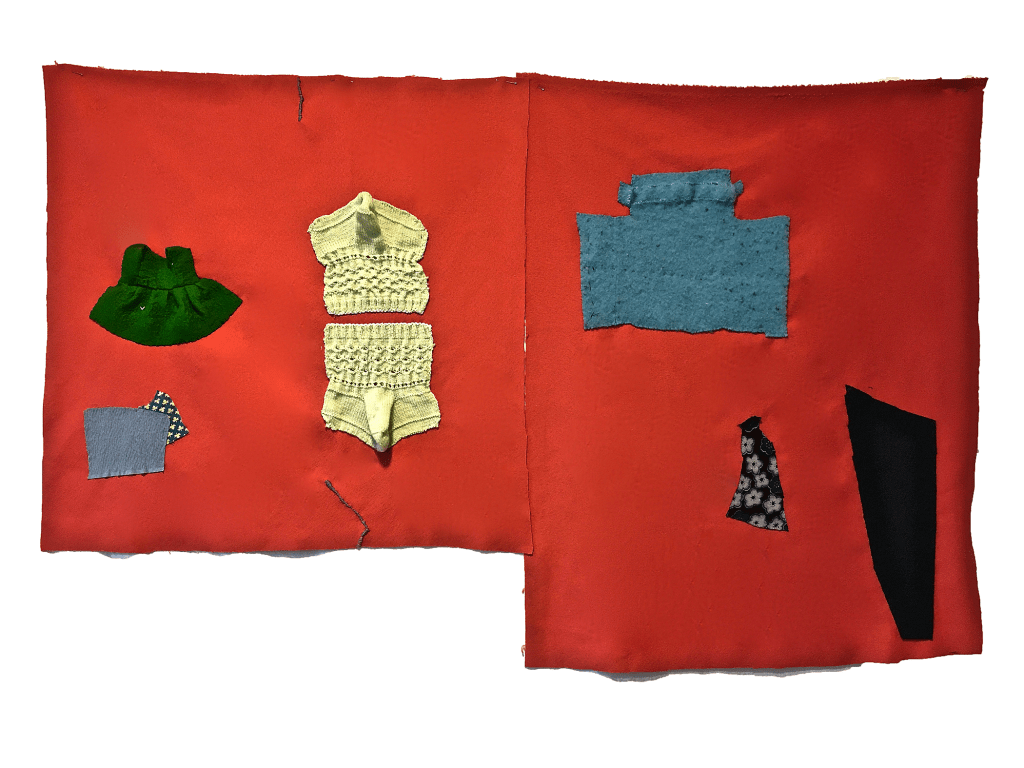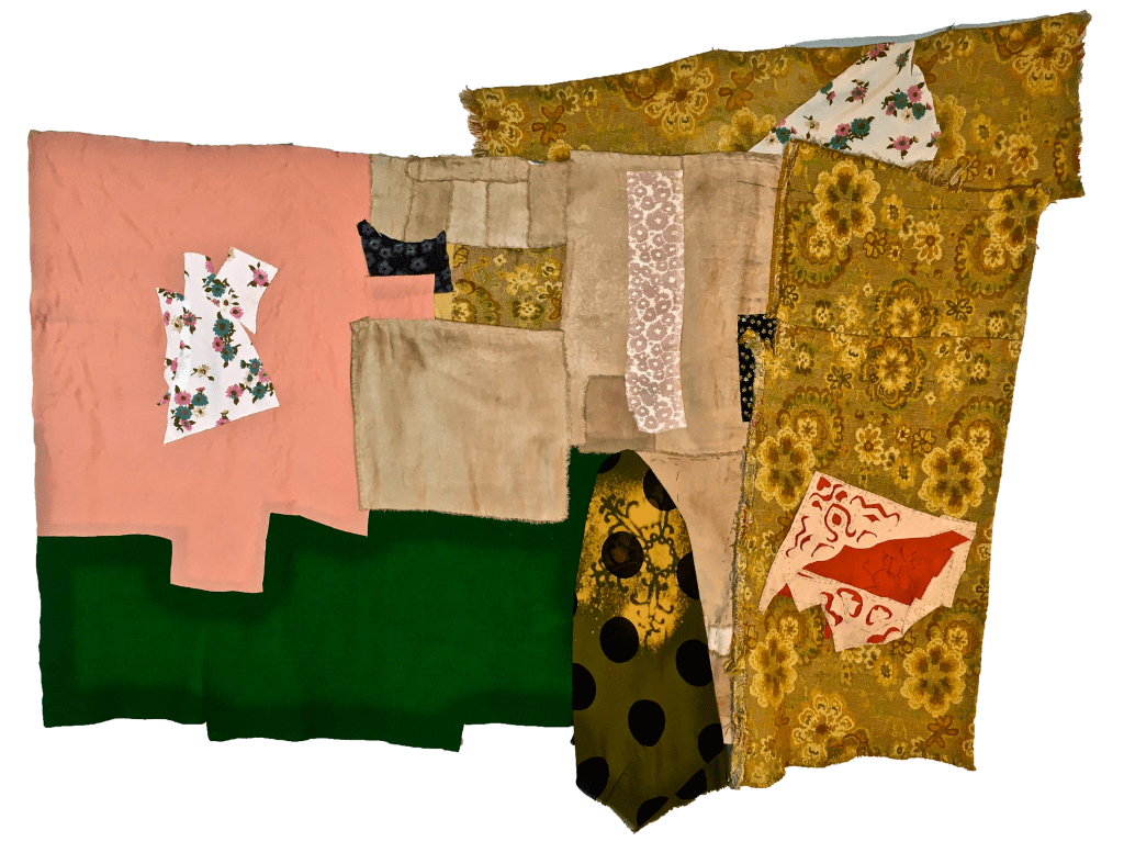 Left panel of a triptych. Used fabric and clothing. 40″x 26 1/2″. Collection of the artist.