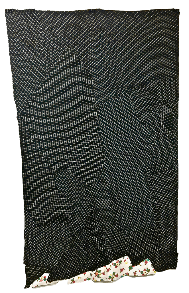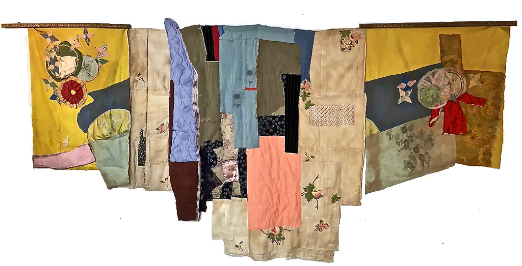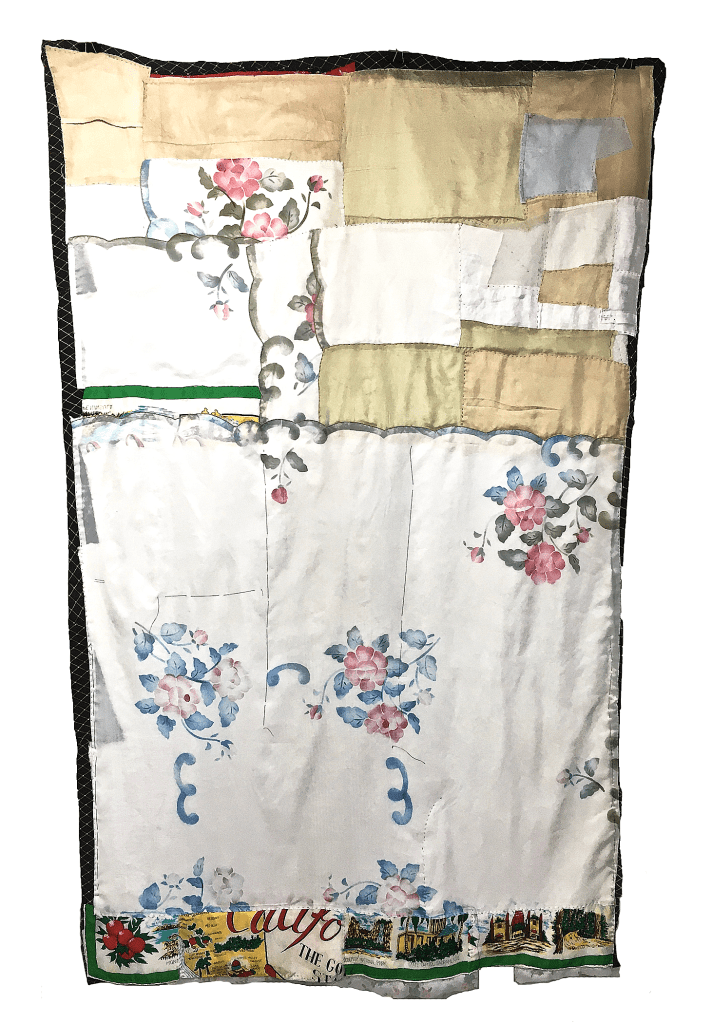Hand sewn mixed fabric appliqué, front and back. 68”x 34”. Collection of the artist.
