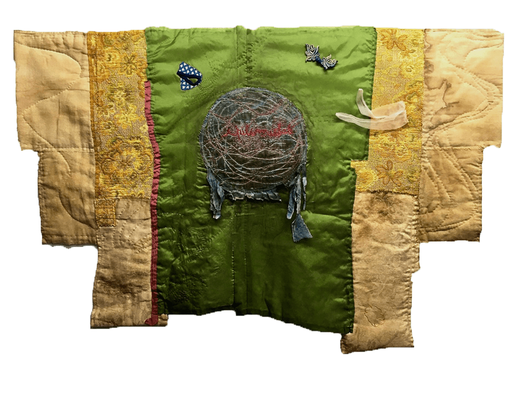 Embroidered, dyed, appliqued and quilted fabric. 41 1/2″x 27 1/2”. Collection of the artist. Collection of the artist.