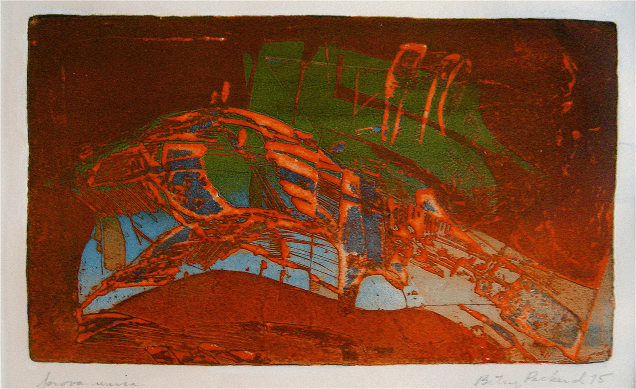 Color viscosity etching, unique proof on rice paper, 17 1/2″x 12”. Collection of the artist.