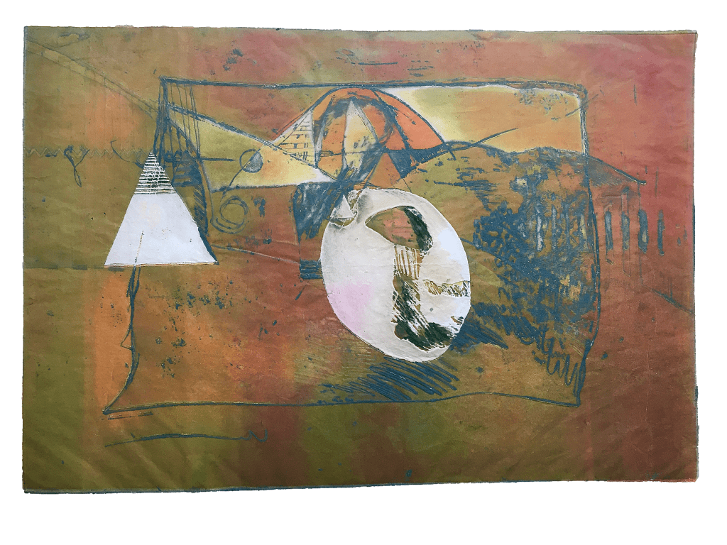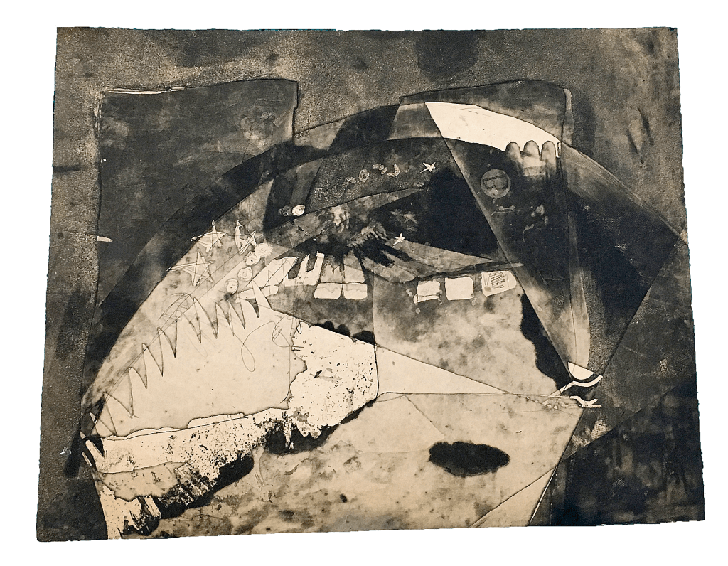 Color viscosity etching, unique proof on rice paper, 17 1/2″x 12”. Collection of the artist.