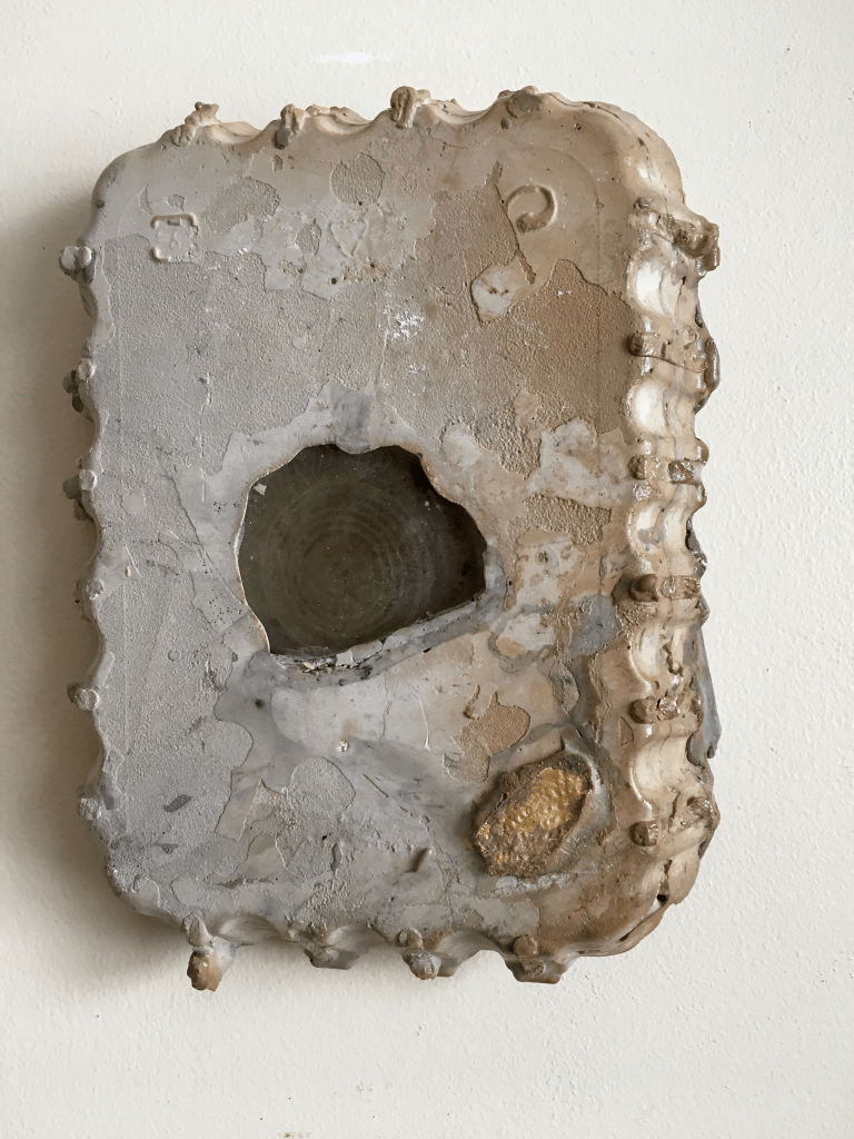 Cement, glass, gold leaf. 8″x 6″x 2 1/4″. Collection of the artist.
