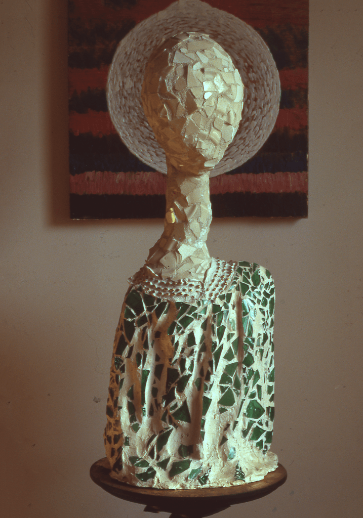 Plaster, ceramic, glass, paint. 26”x 12”x 9”. Collection of Gail Enns.
