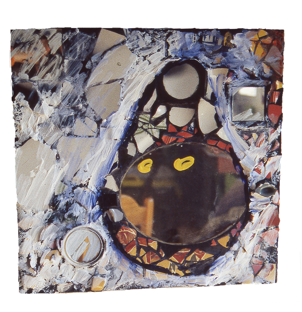 Paint, ceramic, and mirror on wood. 17″x 17″approx. Collection of Elizabeth Becker and Anthony Ruvolo.