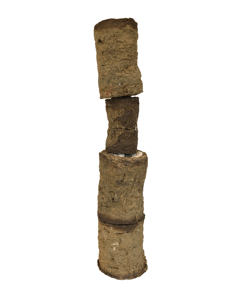 .0548 (after 6 Persimmons). 1978. Rolled newspaper embedded in newspaper pulp. When I cut into this loaf form, I loved its quiet simplicity and immediately thought of the 13th-century Chinese painting “6 Persimmons” by the monk Muqi Fachang. I did this pre-1980s–but see it as transitional.
