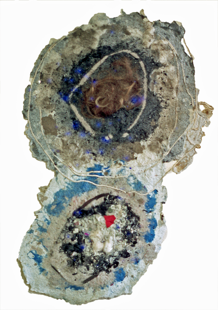 Paper, clay, hair, string, dirt. 24”x 12”. Collection of Tony Krysinsky.