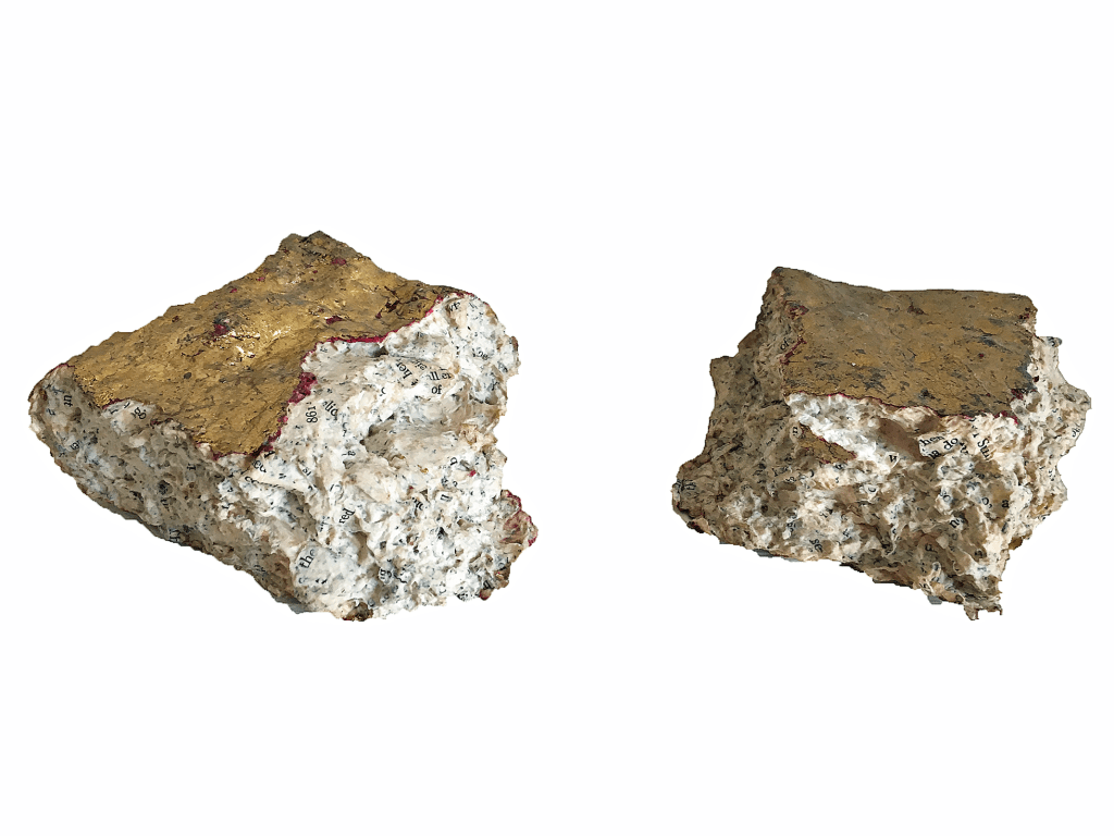 (date unknown ) Pulped book pages, paint, metallic leaf. 2 pieces, approximately 4 1/2″x 4’x 1 3/4″each. Collection of the artist.