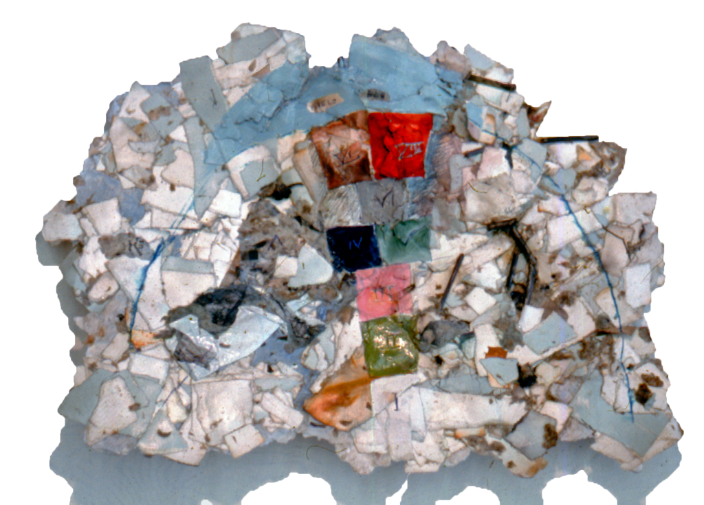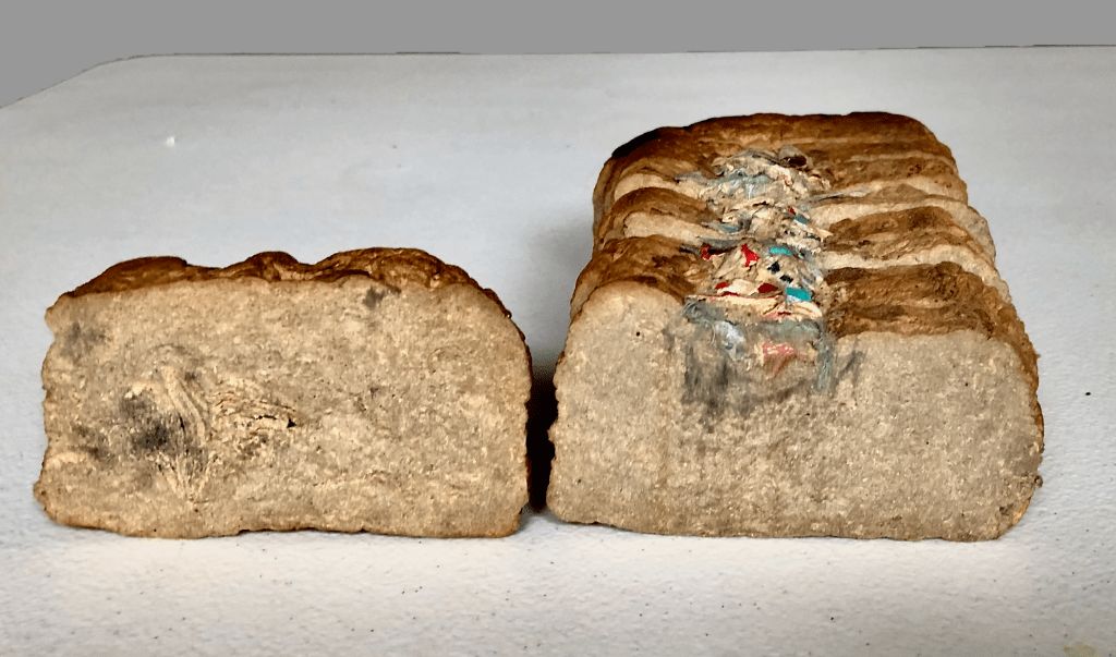 I’ve posted several of this series earlier, but here is some background: In 1978, I made several of these “loaf like” forms, wanting to make something 3 dimensional rather than a sheet of paper with pulp. Initially I had used special paper as my material–saved notes, letters, ticketstubs, i.e.– paper collage elements. It was a first step in creating a “journal” of physical materials- the personal or specific nature of the contents now a mystery to anyone but myself. I wanted to obscure that personal, sentimental element from the work. Newspaper pulp followed as an abundant, easy source of material for sculpture. First I experimented by adding rolled newspaper or embedding colored paper or fabric in the pulp, and cross-sectioning to reveal the center. My stint as a breakfast waitress at the PSA Hotel San Franciscan exposed me to vast quantities of bread, and an appallingly huge volume of barely used paper napkins, which i stuffed in my bag to take home rather than trash. I made some pulp out of those, poured it into my windowscreen “loaf” mold, and left it outside to dry. It yellowed but was still damp after several cloudy days, so I carefully monitored it in a slow oven, where it turned a golden brown. At the same time I was doing some art modeling at the San Francisco Art Institute, thus was given permission to use their shop and saws. When i cut into that loaf , I continued cutting, because of the amazing texture and uncanny resemblance to bread. Several examples can be viewed in the archive in the PAPER category, as well as years 1978, 1979, 1980, 1981. “Bread” .0319, below: