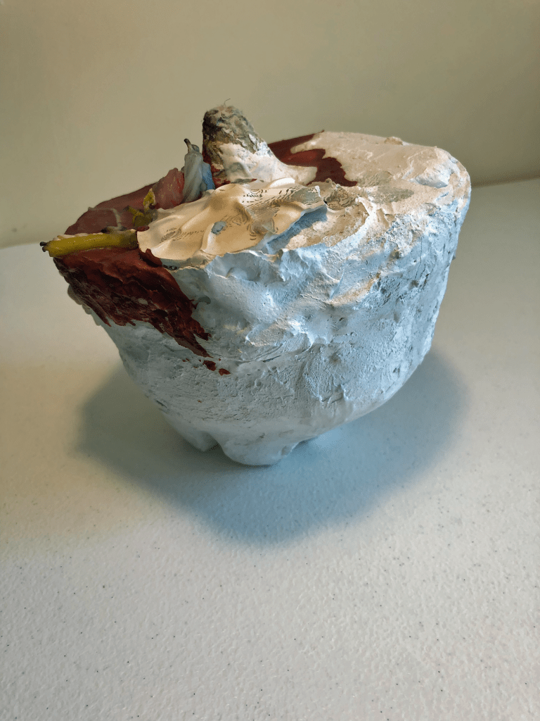 date unknown. Newspaper, plaster, wax. 7″ diameter x 6” tall. Collection of the artist.