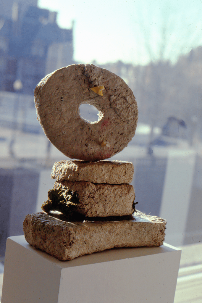 .0548 (after 6 Persimmons). 1978. Rolled newspaper embedded in newspaper pulp. When I cut into this loaf form, I loved its quiet simplicity and immediately thought of the 13th-century Chinese painting “6 Persimmons” by the monk Muqi Fachang. I did this pre-1980s–but see it as transitional.