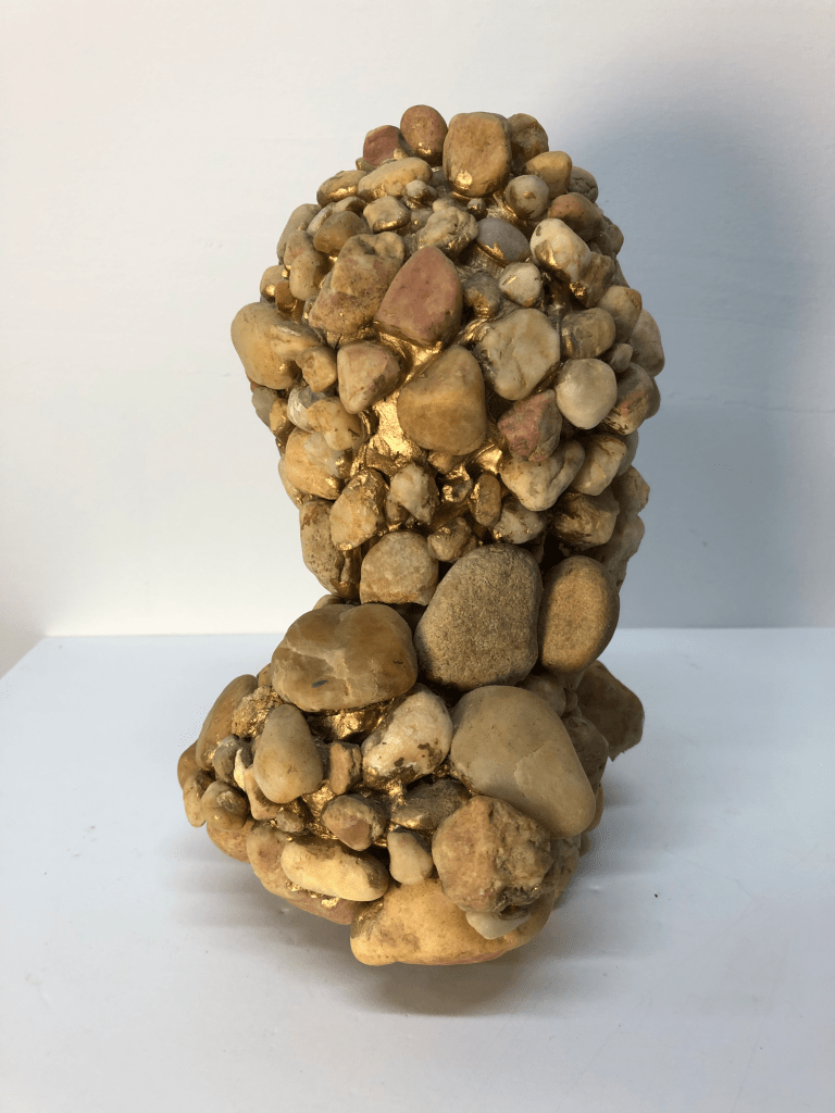 This work coined “Bust of Oliver Wendell Holmes” by a friend. Plaster, rocks, paint. 9″tall x 3″ diameter. Date Unknown. Collection of the artist.