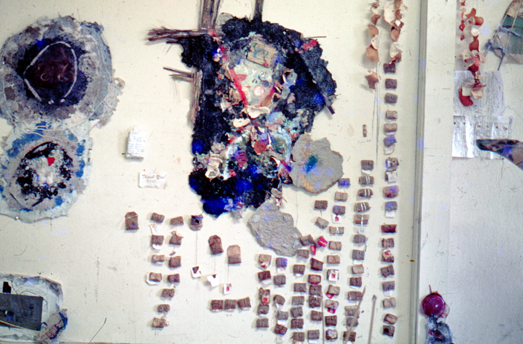 Works in paper pulp, hair, works in progress, saved materials( here, teabags)