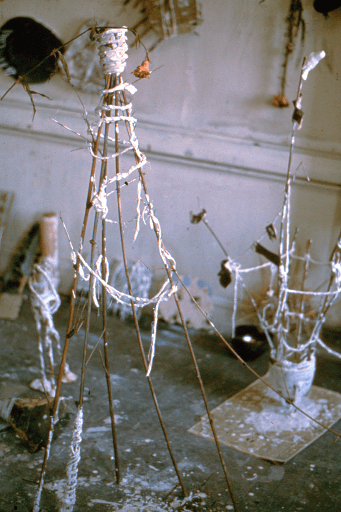 .0619 Bouquet 2003. cement and plastic. 14″x 12 1/2″x 12 1/2″ .0028 Bottle Painting 1982(reworked 1992).corduroy and paint on cardboard. 19″x 17″