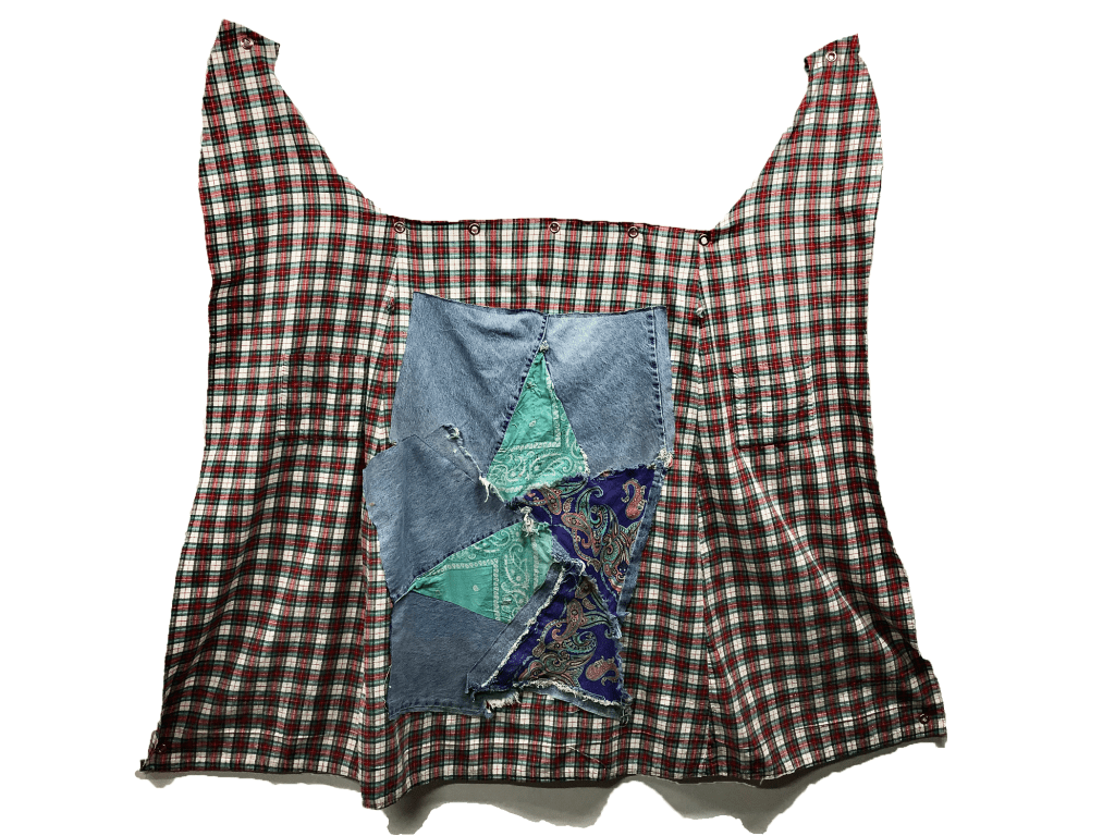 Used fabric and clothing, embroidery, weaving, handsewn. 23”x 21”. Collection of the artist.