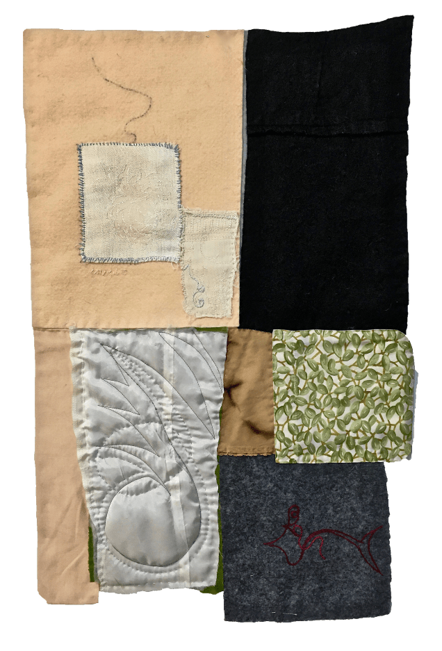 Used clothing applique. 40 3/4”x 29”. Collection of the artist.