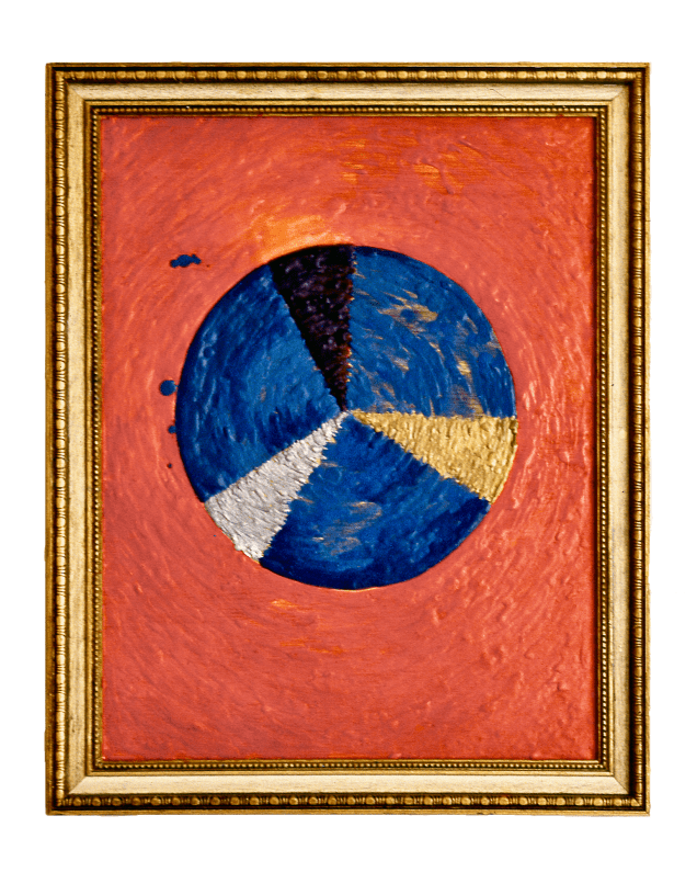 Plaster, paint, metallic leaf on wood. 26″x 22″. Collection of Mary Annella Frank.